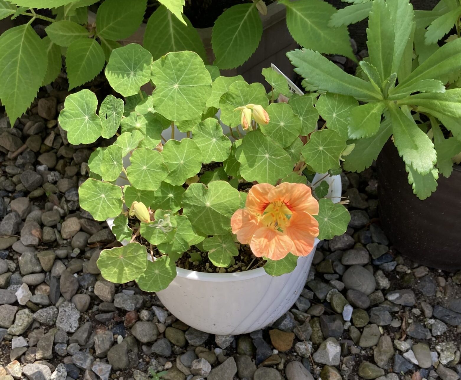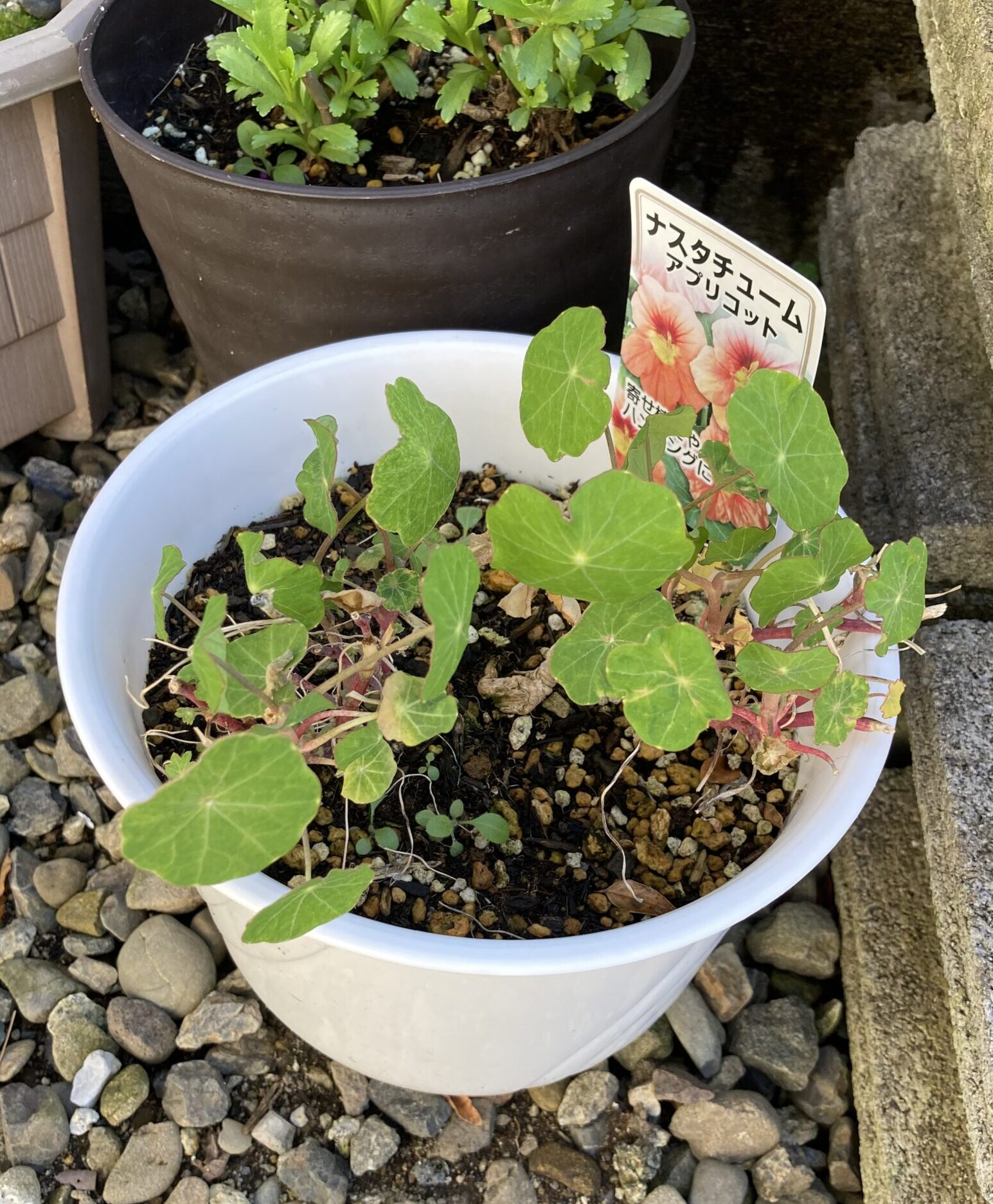 3月の中旬頃、十分暖かくなってきた頃を見計らって、玄関の中で冬越しさせていたナスタチュームを外に出してみました。