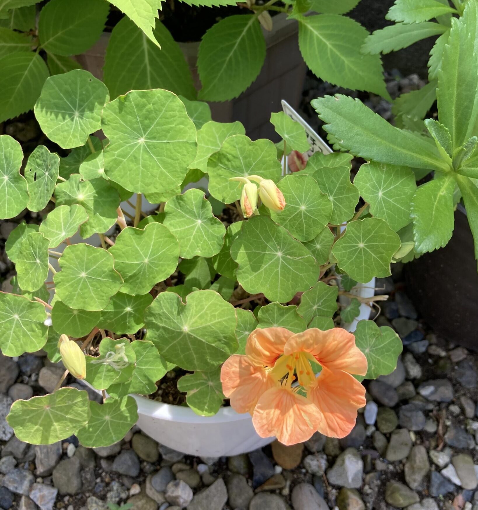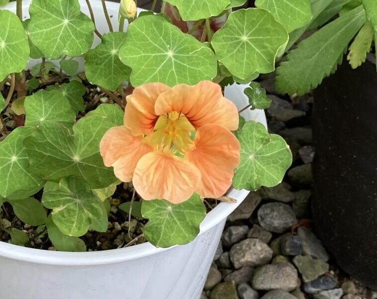 ナスタチュームに花が咲いてきました。ここまでよく頑張ったね、と声をかけてあげたい気持ちで一杯です。